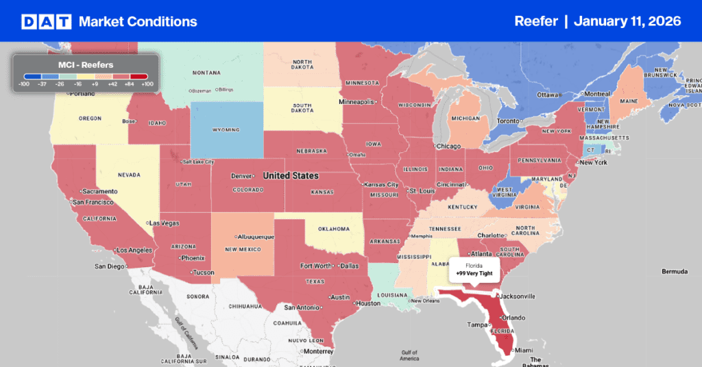 Dry van load post volumes saw a significant week-over-week increase of 16% during the first five-day shipping week of the year (compared to Week 2 of the previous year). This surge in volume, totaling just over 1.5 million load posts, drove the national load-to-truck ratio up by 40% to 10.57.