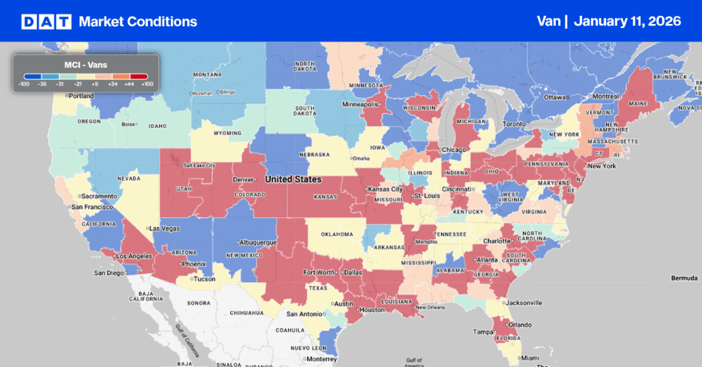 This volume is 67% higher than the 10-year average for Week 2 (excluding the pandemic-influenced years of 2021 and 2022), suggesting that freight brokers are encountering a shortage of available dry van capacity in most freight markets. Supporting this, only eight of the 135 freight markets tracked weekly across DAT’s network reported a decrease in load post volumes week-over-week.
