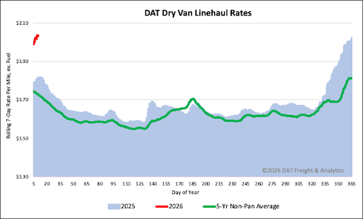 Dry van linehaul spot rates averaged $2.04 per mile last week, a $0.02 decrease after remaining flat the previous week. This rate represents a substantial year-over-year increase, sitting $0.22 (12%) higher than the same week last year. Furthermore, it is $0.31 per mile (15%) higher than the 5-year average, excluding the years influenced by the pandemic.
