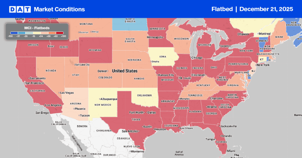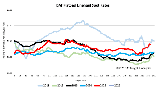 Last week, the national average flatbed spot rate increased by $0.05, reaching $2.12 per mile. Currently, the national average rate is $0.13 per mile, or about 6%, higher than the rate recorded during the same period last year and matches the rate from 2018.