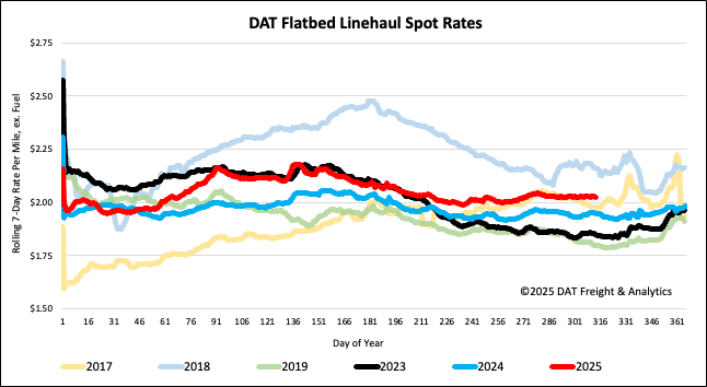 For the second consecutive week, the 7-day national average flatbed rate remained stable, closing last week at $2.05 per mile. This figure represents an increase of $0.08, or 4%, compared to last year. The spot rate last week also surpassed the 2017 rate by $0.04 per mile and was $0.07 per mile, or 4%, higher than the average for Week 45 over the past decade.