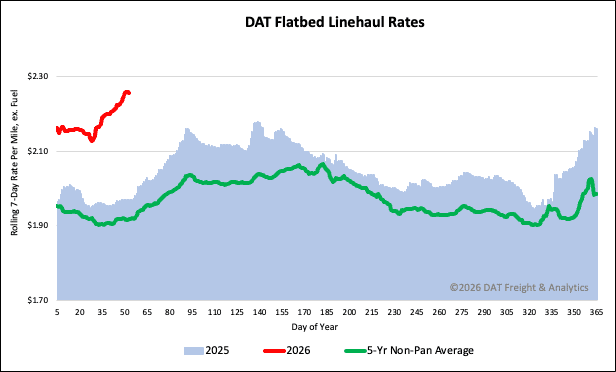 The national average spot rate for flatbed linehaul has increased for the fourth week in a row, settling at $2.26 per mile last week. This represents a $0.02 per mile gain from the previous week. This current rate is notably strong: it is $0.29 per mile (15%) higher than the rate recorded in the same period last year, $0.24 per mile above the 2018 level, and $0.34 per mile (15%) higher than the 5-year average (excluding years affected by the pandemic).