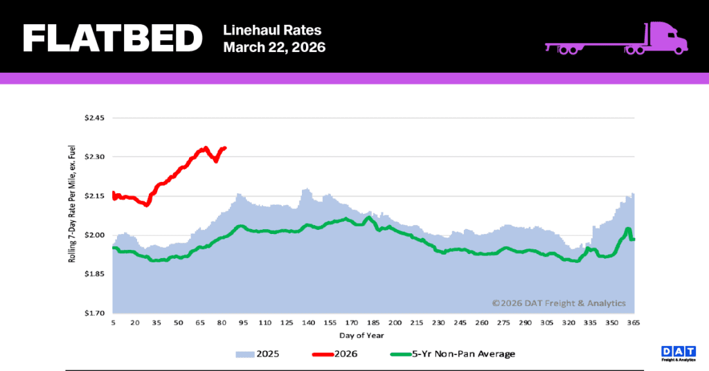 The national average spot rate for flatbed linehaul has risen to $2.34 per mile, marking a $0.03 increase last week. This rate is substantially higher than previous years, exceeding the rate from the same period last year by $0.25 (12%) and surpassing the five-year average (excluding pandemic years) by $0.35 (15%).