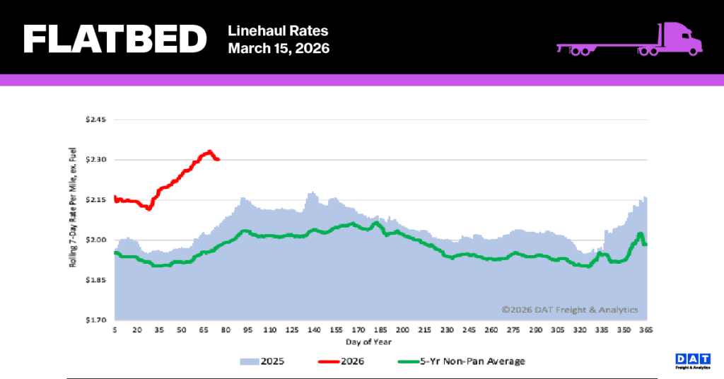 The national average spot rate for flatbed linehaul dropped to $2.31 per mile after a $0.02 decline last week, interrupting a six-week upward trend that had seen rates increase by $0.16 per mile. Despite this recent dip, the rate remains significantly elevated compared to historical data: it is $0.25 (12%) higher than the rate from the same period last year, $0.12 higher than the 2018 rate, and surpasses the five-year average (excluding pandemic years) by $0.34 (15%).