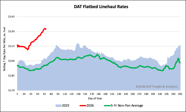 The national average spot rate for flatbed linehaul reached $2.33 per mile last week, marking the fifth consecutive week of increases in the $0.03 to $0.04 per mile range, including a $0.04 rise last week. This rate is significantly higher than previous years: $0.29 per mile (15%) above the rate from the same time last year, $0.16 per mile higher than the 2018 rate, and $0.37 per mile (16%) greater than the five-year average (excluding pandemic-impacted years).