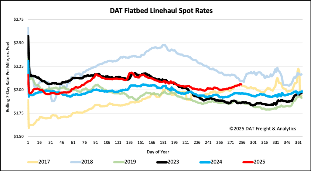 Flatbed rates experienced a modest increase last week, rising by a penny to just over $2.07 per mile. This current rate is $0.10 higher than last year and $0.20higher than in 2023. Notably, the 2025 spot rate continues to track closely with 2017, a year marked by a strong industrial economy for flatbed carriers.