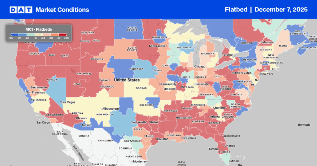Flatbed load post volumes almost tripled during the post-Thanksgiving catch up week, driving the load-to-truck ratio up to 29.14.