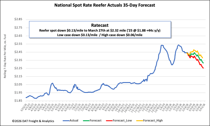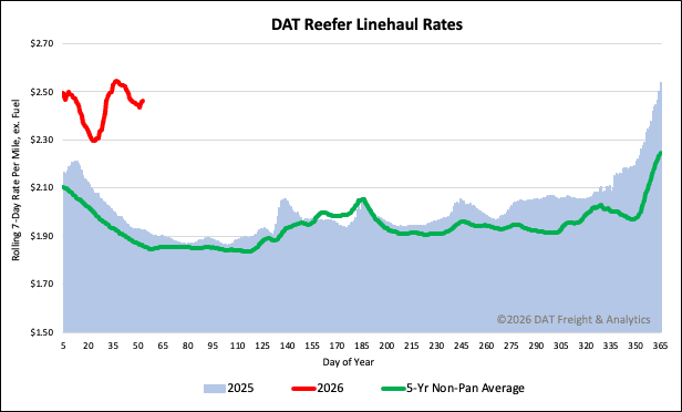 Reefer posted rates have declined for the second consecutive week, dropping a total of $0.11 per mile, including a $0.07 per mile dip last week. This reduction has eliminated half the gains realized from Winter Storms Fern and Gianna. Despite the recent cooling, the national average reefer spot rate, excluding fuel, remains high, settling at $2.46 per mile. This rate is significantly elevated compared to both last year and historical averages, sitting $0.53 per mile (28%) above the rate for the same period last year and surpassing the 5-year average (excluding pandemic years) by $0.60 per mile, or 24%.