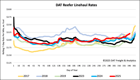 The national 7-day rolling average spot rate rose by $0.03 per mile last week, reaching a national average of $2.21 per mile. This rate is significantly higher—roughly $0.20 per mile, or 10%—than reefer spot rates from the same period last year. Excluding the exceptionally high rates seen during the Pandemic years of 2020 and 2021, this is the highest Week 50 rate ever recorded.