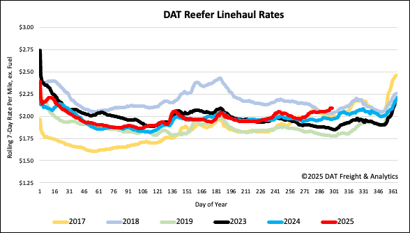 Last week, the national 7-day rolling average for reefer carriers climbed to $2.10 per mile, marking an increase of just under $0.02 per mile. This rate continues to surpass previous years, exceeding last year’s average by $0.12 (6%) and 2023’s by $0.24. Notably, last week’s rate even edged out the 2018 bull market by $0.05 per mile, albeit on the tail end.