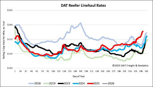 The surge in demand for “protect from freeze” capacity meant that trucks normally hauling perishable produce were diverted to move general freight, tightening the reefer market even further. This temporary capacity squeeze provided a brief, profitable reprieve for refrigerated carriers who were able to operate safely despite the hazardous conditions, helping to offset the sustained margin pressure they faced throughout 2025. As marginal capacity continues to exit the freight market, this first major winter storm of the season is a timely reminder of just how much impact cold weather is going to have on the temperature controlled freight market over the coming winter, especially for reefer carriers.