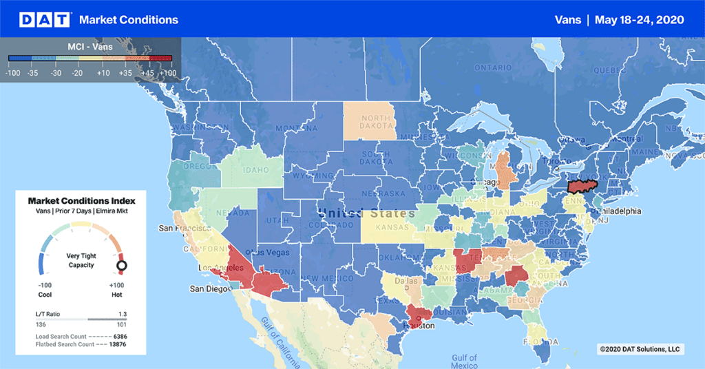 There are still hot markets for truckload freight all along the sunbelt, with a big uptick last week out of Texas. Produce continues to drive demand for reefers and some dry vans in the Southeast. And reopened manufacturing is contributing to other hot markets throughout the Midwest and Northeast.